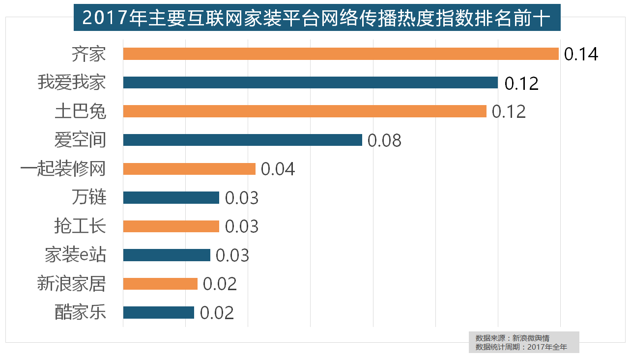 2017年,我们遴选了跨越500个品牌进行数据统计取阐发,齐家、我爱我家、土巴兔、爱空间、一路拆修网的收集热度指数排名前五,